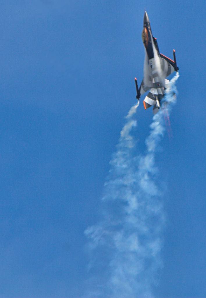 Samainen F-16 poikkeuksellisen pilvetöntä taivasta vasten.