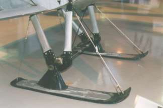 At least three different ski types were used. The first ski type had attachment brackets welded out of five round steel tube struts, which were also wire braced. The first ski version had a round nose and rear end and both ends had upwards curvature. This ski had a square, tapered piece of lumber as longitudinal reinforcement in the center line. The steel struts were attached to four wooden blocks, which were as high as the reinforcement in the center.
